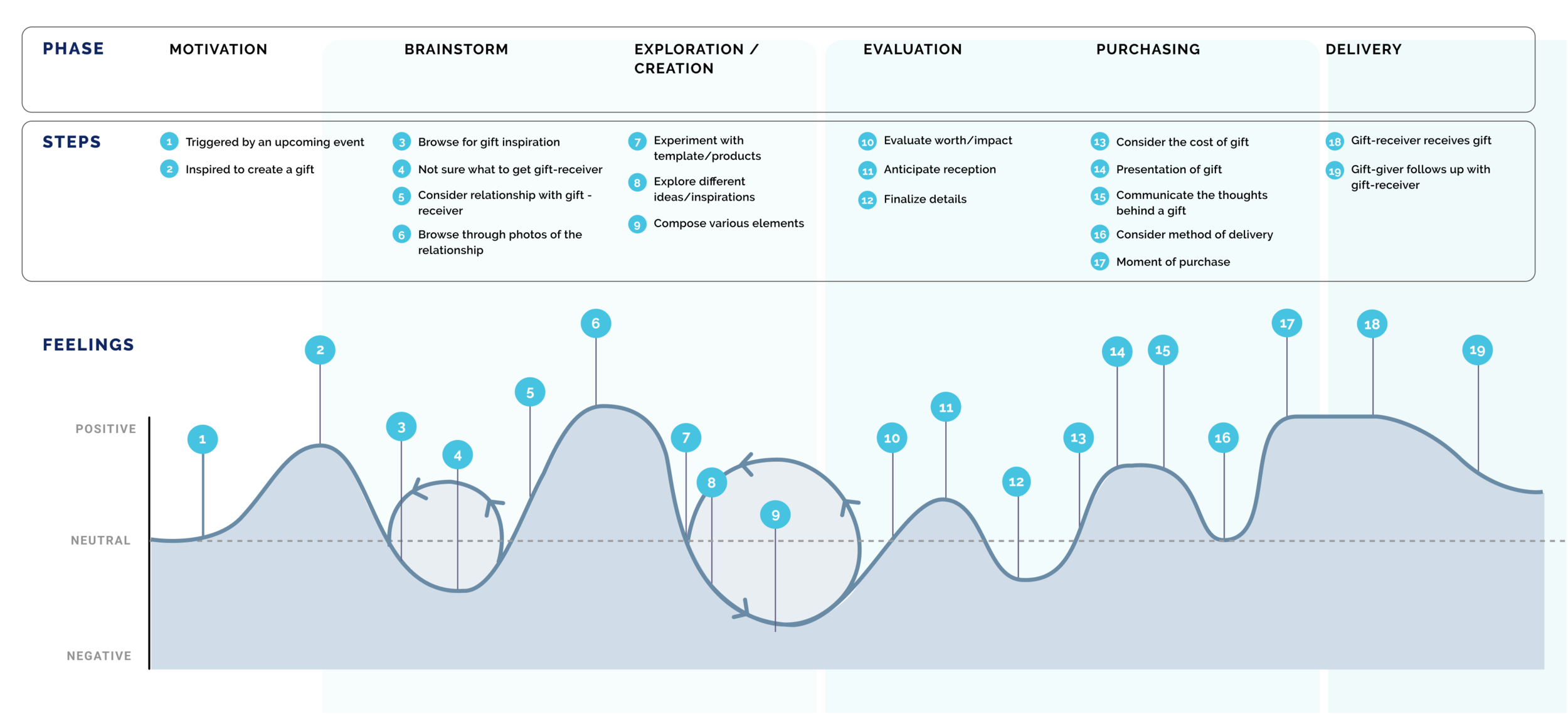 Additionally, a phase determination survey found that ~50% of the participants considered brainstorming to be the hardest part of the process. By mapping out a typical Zazzle customer experience and synthesizing the survey, we examined the root causes behind people’s troubles with getting started and ideating.