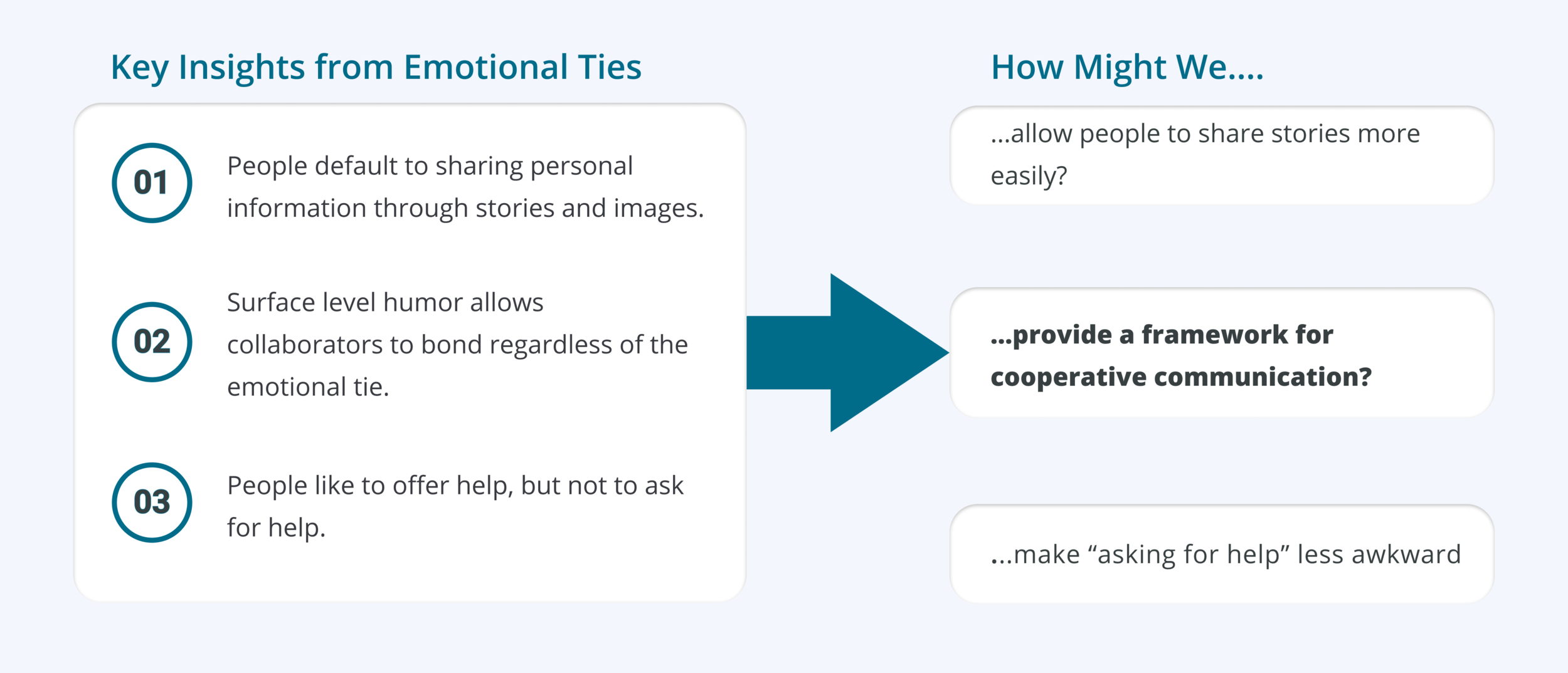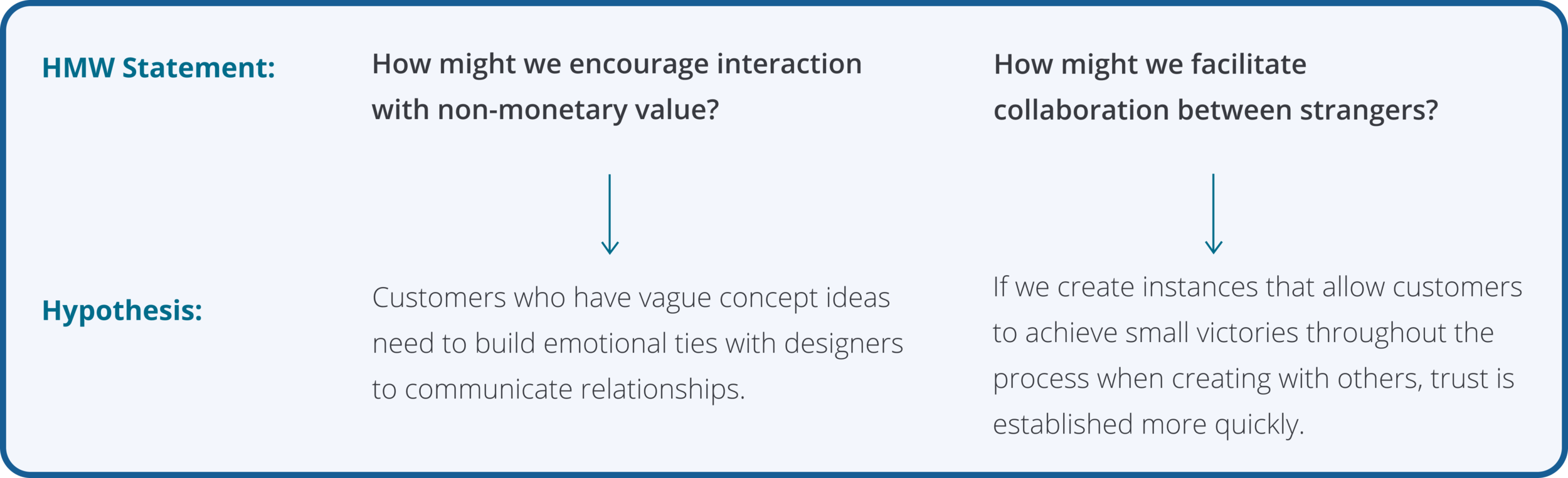 For each theme, we formulated hypotheses for further testing. To form the hypotheses, we generated How Might We statements, and transformed those into testable hypotheses.