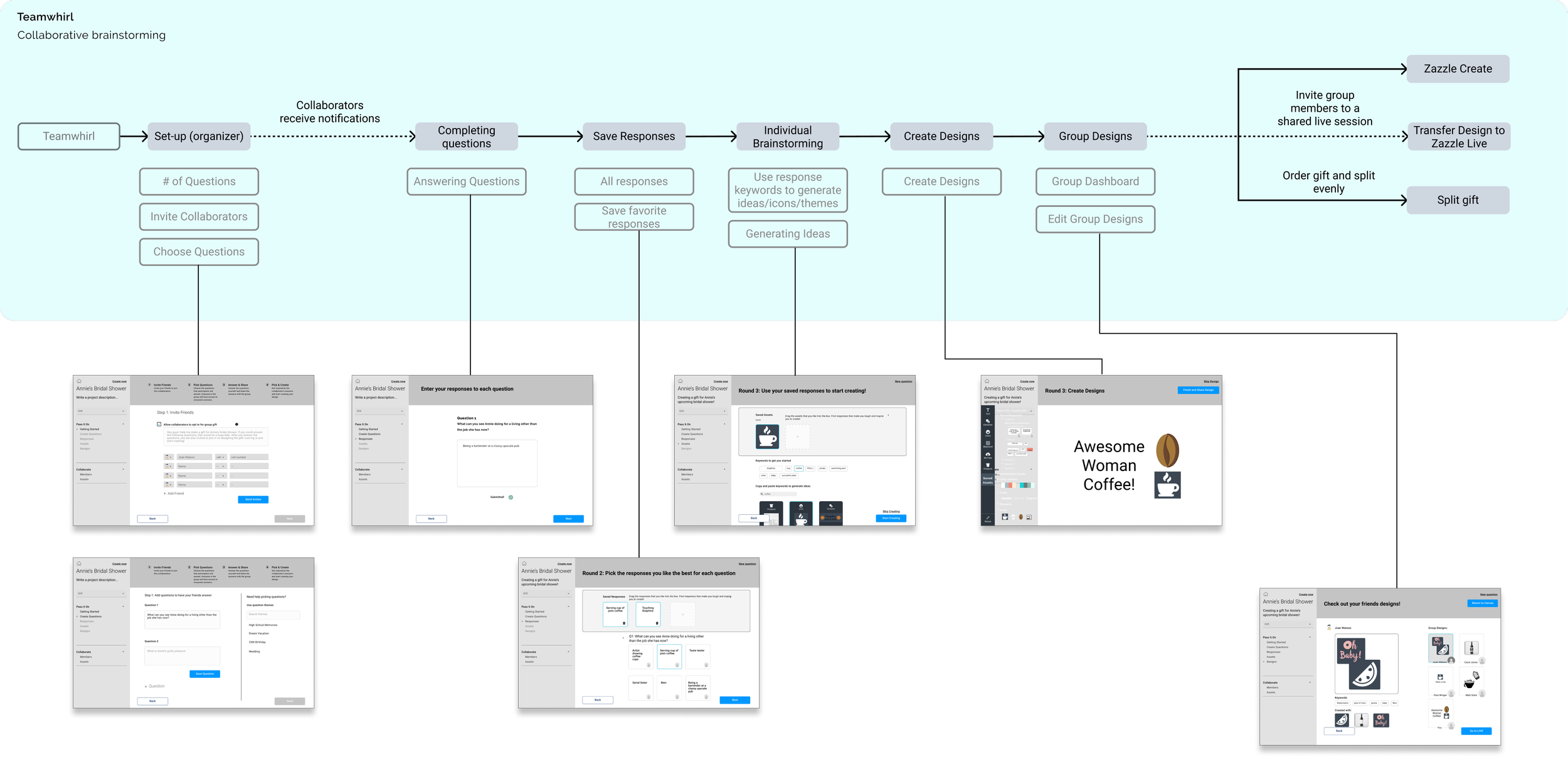 Based on the foundation of collaboration, Teamwhirl (originally called Pass It On) leverages the knowledge and perspectives of others as sources for inspiration. This user flow is diagrammed to consider how a Zazzle user would set up the activity, invite collaborators, and encourage invited collaborators to, ultimately, create.