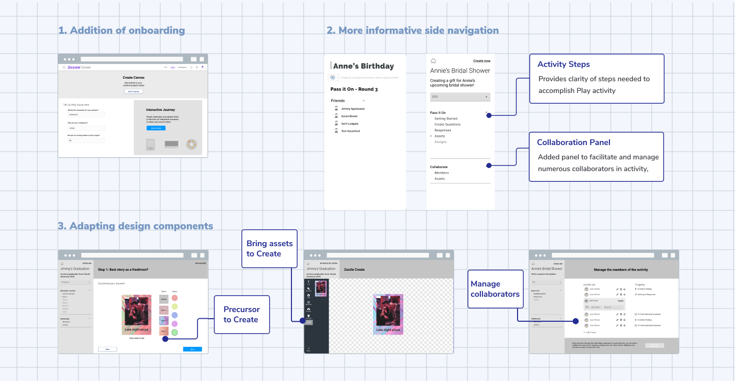 Increased flexibility is essential to the users’ having a personalized Zazzle experience, which ends with their ideal output. In order to achieve that goal, the mid-fidelity prototype focused on fleshing out the path that users take to get to the specific activities. Specifically, we built out a new Zazzle landing page experience with on-boarding to direct visitors to the best activity for them.