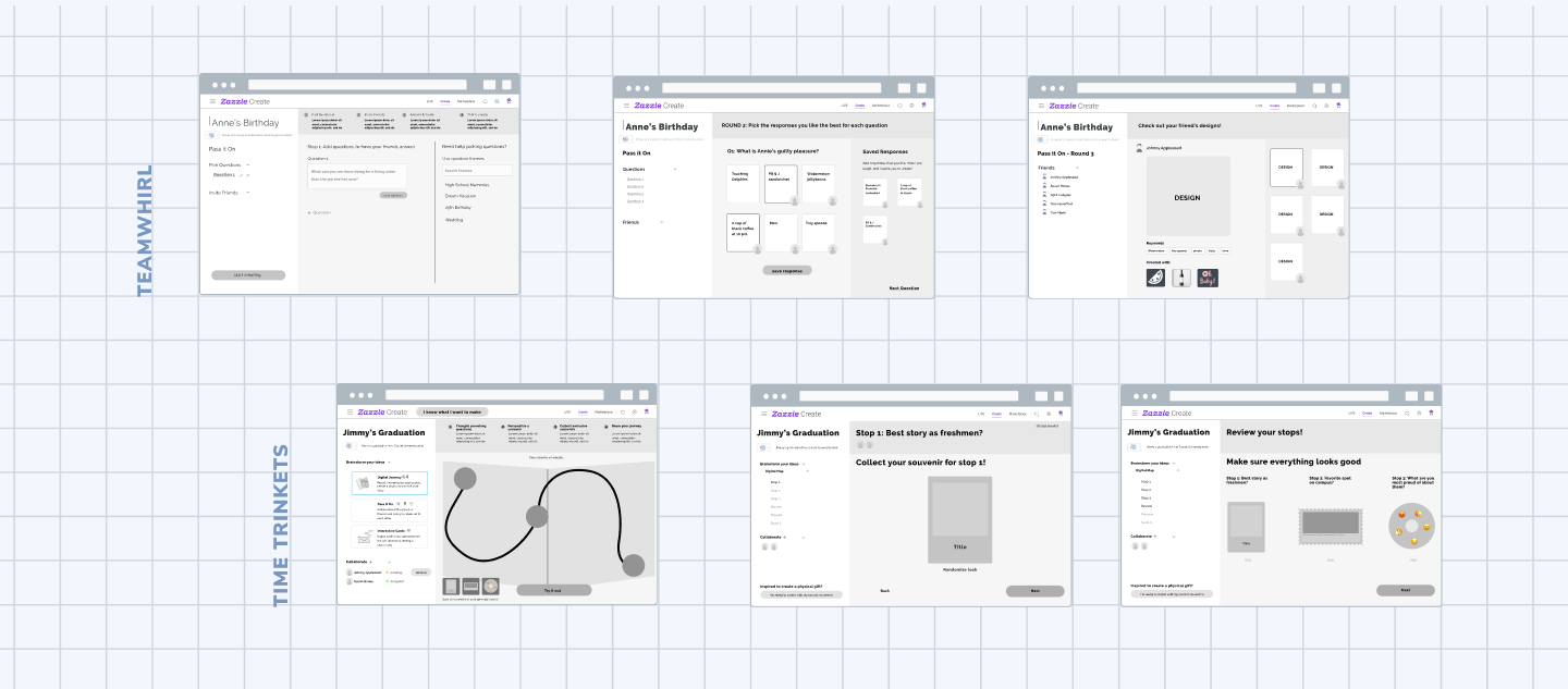 As we focused on activities that help users with brainstorming, the top two activities were Time Trinkets, and Teamwhirl. Time Trinkets is an activity that uses memory recollection to help in ideation, and Teamwhirl is a group brainstorming activity to generate relevant ideas. While both activities seek to facilitate brainstorming and jumpstart creative projects, they do so in very different ways. As a result, diagramming the user flows prior to designing was necessary in order to demonstrate the similar purpose, yet differing value of each activity. Both activities went through numerous rounds of iterations in transitioning from sketches to high-fidelity interfaces.